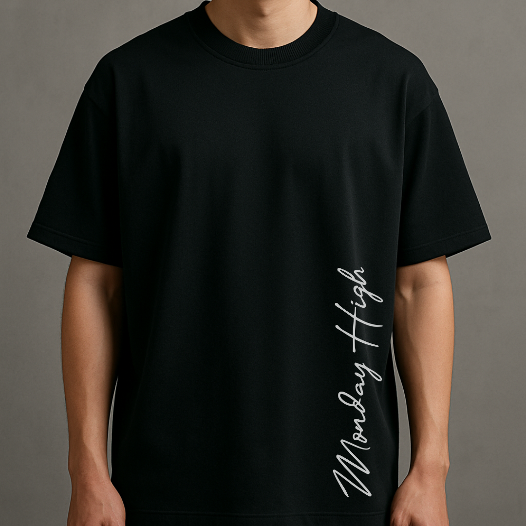 The relaxed fit provides a modern, laid-back silhouette, while the ribbed neckline enhances shape retention and comfort. A bold vertically printed logo on the side adds a touch of contemporary edge, making it a standout piece for casual and streetwear looks.